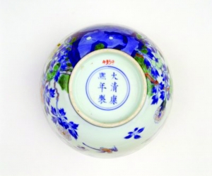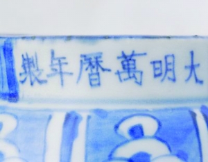 在青花瓷上,用寫、刻、印等方法標(biāo)明瓷器燒造年代的款識,稱為紀(jì)年款。我國古代瓷器款識,以紀(jì)年示為主,紀(jì)年款又分帝王年號的年款和以天干地支表明年號的干支款兩類。明代永樂年間,在青花瓷上開始出現(xiàn)紀(jì)年款,篆書字體飄逸流暢,邊飾蓮瓣紋。宣靖款端莊剛勁。成化款鐵劃銀鉤,釉面有云蒙氣。嘉靖款筆畫粗重,勁中藏秀。前人曾將明代紀(jì)年款歸納為:“宣德款多,成化款肥,弘治款秀,正德款恭,嘉靖款雜”五句話。清代康熙款字體工整,青花料色明麗。雍正款楷書蒼勁有力,格式講究。乾隆、嘉、道光款多為篆體,字體排列緊密,猶如一枚篆印。近代款識中“江西瓷業(yè)公司”款較多,楷書秀逸,其中還有英文款“CHINA”,是近代出口瓷的標(biāo)志,是青花中最早使用的英文款。民窯青花瓷的紀(jì)年款很少,有“大明年造”等,字體草率。書寫得很隨意。