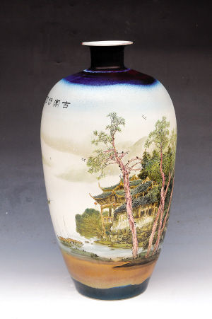蔡玲玲,筆名玉人,江西省工藝美術(shù)大師,江西省高級工藝美術(shù)師,她的“山水”陶瓷作品展現(xiàn)了女藝術(shù)家特有的敏感和細(xì)膩。在表現(xiàn)主題上,蔡玲玲突破了傳統(tǒng)陶瓷一貫的方式而追求現(xiàn)實(shí)表達(dá),并能充分運(yùn)用景德鎮(zhèn)多種傳統(tǒng)裝飾技法來呈現(xiàn)自己對大自然的崇敬和女性特有的平和情懷。她大膽地利用陶瓷色釉在窯變中產(chǎn)生的特殊效果,使天空如彩虹、朝霞變化萬千,有的更似萬株禮花綻放蒼穹。藍(lán)或褐的色釉窯變則讓大地呈現(xiàn)厚土的凝重肌理。古彩、粉彩、新彩的多種技法不但豐富了作品的色彩,更突現(xiàn)了畫面的層次感。在她作品中,遠(yuǎn)山連綿起伏,近水碧波蕩漾;幾間古樸的農(nóng)舍,數(shù)株蒼勁的大樹,河邊小船靜泊,山澗瀑布飛流;白云飄渺,炊煙繚繞;天空小鳥自由飛翔,水中群鴨逐波戲水;村姑或挎籃拾階而上,或倚橋婉聲歌唱。整個畫面充滿著春意盎然的田園風(fēng)光,又使人宛如置身于寧靜祥和的世外仙境。源于生活而高于生活,用景德鎮(zhèn)特有的陶瓷文化資源讓我們在城市喧鬧的環(huán)境中品嘗美妙的田園風(fēng)光,陶醉在山水天地之間,這正是蔡玲玲山水作品的神韻之處。