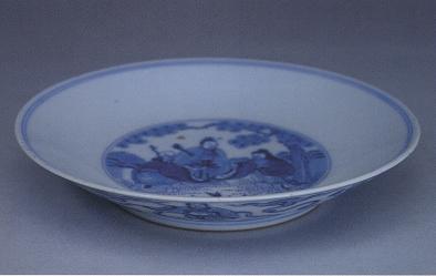 盤徑15cm,內(nèi)繪虬干松樹,樹下站3位老者,分別為福、祿、壽三星,寓意為“三星高照”。盤外壁繪民間傳說的“八仙過海”的故事,逍遙自在的八仙立于水面之上,各顯其能,施展著過海之木。畫面生動(dòng),人物形象栩棚如生。青花色澤清新,釉面細(xì)膩。盤底有“敦睦堂制”款。