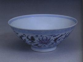 該碗口徑9.8cm,造型規(guī)整,胎薄釉白。撇口,淺腹,腹下收斂,圈足。外壁口沿處繪忍冬紋,腹部為纏枝蓮,碗心雙圈內(nèi)繪折枝花卉。紋飾清晰,制作精細(xì)。碗底有“大清道光年制”青花方形篆書款。