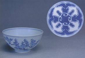 該碗口徑13.2cm,圓形,圈足。胎質(zhì)密,碗體施白釉,釉質(zhì)細(xì)膩滋潤。外壁為松、竹、梅組成的畫面,既有獨幅國畫的觀賞價值,又是整體裝飾圖案的一部分。造型凝重渾厚。