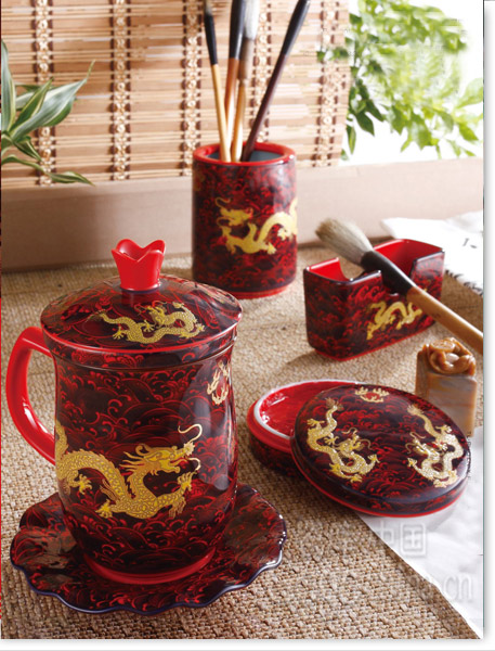 臺灣皇殿紅瓷黃金龍文房四寶,被稱作為新世紀的文房四寶代表作之一。分為筆筒、筆架、茶杯、印泥。每件器物都是經(jīng)過細作,海水金龍的紋飾生動、細密,胎質(zhì)堅硬,造型優(yōu)雅。置于辦公室或書房的工作臺上,更顯高雅之氣。