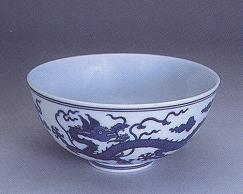 墩式碗的燒制始于明代洪武時(shí)期,該碗口徑14.7cm,直口,垂腹,圈足。器內(nèi)繪一條曲形龍和云紋,外腹為兩條首尾相逐的行龍,以云紋為襯托。底中有無(wú)框“大清道光年制”青花篆書(shū)款。青花色濃藍(lán),繪畫(huà)受當(dāng)時(shí)畫(huà)家的影響,線條纖細(xì),畫(huà)面板滯,缺乏動(dòng)感和生氣,是道光時(shí)期紋飾風(fēng)格的典型代表。