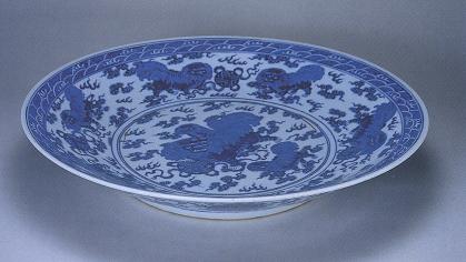 瓷盤徑50.4cm,撇口,淺腹,平底,固足。內(nèi)沿繪水浪紋,壁及底飾9只大小不一、形象各異的獅子紋,以繡球和火焰云為陪襯,形成一個(gè)獅子滾繡球  的壯觀場(chǎng)面,外壁為纏枝蓮。繪畫規(guī)整,構(gòu)圖嚴(yán)謹(jǐn),層次多而清晰。
