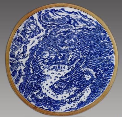 這是一幅用青花料繪制、以御窯廠為主題的景德鎮(zhèn)圖。中心所繪即“珠山御窯廠全貌”,儀門旃桿上高掛“上奉旨御窯廠”旗,清晰可見。街上的行人摩肩接踵,挑柴、擔(dān)坯,你來我往,十分熱鬧。圖的大部分為屋宇覆蓋,煙囪林立,可見瓷都人煙稠密,多以陶為業(yè),表現(xiàn)了十三里陶廠的繁華景象。