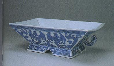 方形器物最難制作,因造坯時,要棱角正直,結合緊密,上下左  右要對稱。此簋仿青銅器,做工精細,造型優(yōu)美,給人以古樸莊重之  美感。高7.7cm,口徑23.7*14.3cm。主題紋飾為騰躍飛舞的夔鳳紋,青花顏色明快。底款為朱紅“鋤  月山莊仿吉”,鋤月山莊是清代光緒時期景德鎮(zhèn)瓷器堂名款。