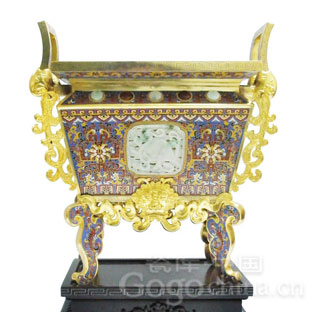 鼎體四面有用翡翠精雕而成的四方神嵌在中央。鼎肩有16粒翡翠和紅瑪瑙精制圓點嵌制而成。珍品予人總體感觀體現(xiàn)了景泰藍古雅華貴與金碧輝煌。精雕四神活靈活現(xiàn),玲瓏剔透珠光寶氣,展示神通廣大氣勢不凡態(tài)勢。珍品寓意象保平安、螭虎助力、四神在此歷保萬年。是一件空前難得的鎮(zhèn)店、鎮(zhèn)宅之寶,官臣有極高的收藏價值。