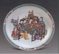如圖2為清雍正景德鎮(zhèn)窯瓷胎畫琺瑯?gòu)邋鷮?duì)弈圖盤。高4.4厘米,口徑20.5厘米,底徑13厘米。這只雍正瓷胎畫琺瑯?gòu)邋鷮?duì)弈圖盤高4.4厘米,口徑20.5厘米,底徑13厘米,是根據(jù)清代宮廷畫家陳枚《月曼清游》圖冊(cè)中的《閑庭對(duì)弈》圖所繪。盤心繪五仕女圍桌對(duì)弈,仕女的體態(tài)頎秀婀娜,眉目俊美端莊,裙衫華麗,鬢飾高雅,氣質(zhì)矜貴,可見(jiàn)是身份較高的貴族婦女。在人物情態(tài)的表現(xiàn)方面,每個(gè)人的神情都圍繞著棋局的進(jìn)展,或沉吟猶豫、或欲言又止、或悠悠閑觀、或悄聲議論,都能各盡其態(tài),生動(dòng)而不失人物性格的嫻淑溫雅。人物后以多寶格為背景,格上書籍文玩陳設(shè)繁復(fù),皆具透視與實(shí)感效果。室內(nèi)擺設(shè)富麗堂皇,恰是一幅“鏡戶團(tuán)圓清晝永,揪枰斜倚共敲棋”的閨樂(lè)圖。瓷胎畫琺瑯器源自于銅胎琺瑯器,創(chuàng)燒在康熙中晚期,終止于乾隆初年。基本上由清宮造辦處掌握彩料、彩繪和彩燒工藝,制成品又局限于宮廷御用,“庶民弗得一窺”。 此盤胎質(zhì)細(xì)膩,釉面光潔,釉色白中泛青。繪畫工細(xì),設(shè)色淡雅,人物、場(chǎng)景刻畫精微。底部“雍正年制”四字楷書藍(lán)料款,為不可多得的瓷器珍品。
