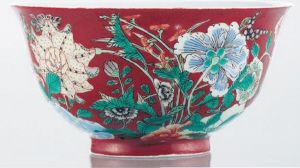清宮御瓷九秋同慶:康熙后期清宮彩瓷一改此前雄麗蒼勁之風(fēng)格,特別在吸納西洋技藝之后,彩料細(xì)膩柔和,氣息婉約清新,以致名品迭出,驚艷古今,煥發(fā)彩瓷魅力之新姿采。2010年秋天在北京保利上拍的“御制珊瑚紅地琺瑯彩九秋同慶碗”即為當(dāng)中杰出的一例,成交價(jià)高達(dá)448萬元。