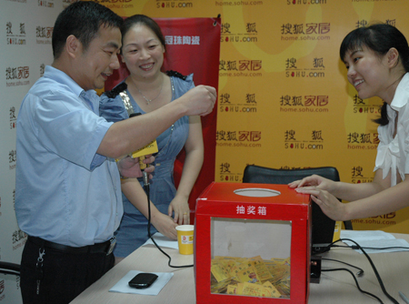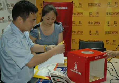 【彭經(jīng)理】:各位網(wǎng)友大家好,我是冠珠陶瓷廣東大區(qū)經(jīng)理彭經(jīng)理,很榮幸今天能借助搜狐的網(wǎng)絡(luò)平臺與各位消費者和網(wǎng)友們一起見證此次抽獎活動。冠珠陶瓷是新明珠集團旗下的知名陶瓷品牌,在19年的成長歷程中逐步被行業(yè)認可,更受到了越來越多消費者的喜愛與支持。為答謝廣大消費者,冠珠陶瓷攜手全國經(jīng)銷商開展感恩促銷活動,7月30日至8月1日活動在廣西火熱進行,大家可以看看這就是活動當天店里的促銷現(xiàn)場,非常火爆,僅3天廣西的成交量就達兩千多戶;顒又畜@喜不斷:有進店送禮、新品買三送一等為消費者實實在在省錢的促銷內(nèi)容,其中一項就是今天即將在這里進行的鉆戒抽獎活動。今天的抽獎儀式將現(xiàn)場抽出5名鉆戒中獎者。只要你參與了我們的活動,就有機會得到一張抽獎券,各地經(jīng)銷商再將抽獎券快遞到佛山冠珠陶瓷總部。