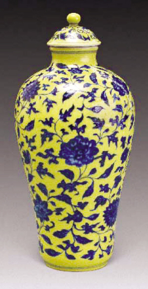 黃釉彩瓷在此時期也有了較高水平的發(fā)展,特別是仿明弘治的黃釉青花花果盤、檸檬黃釉青花瓷器、雞油黃釉綠彩器和少量的黃釉粉彩器。這些器物雖然數(shù)量不多,但是極具收藏價值,在每次拍賣中都有不俗的表現(xiàn)。