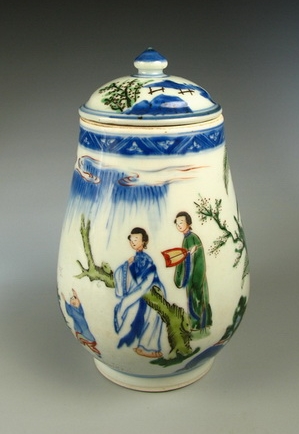 明末天啟(1620—1672)、崇禎(1628—1644)時(shí)由于政治動(dòng)蕩,導(dǎo)致百業(yè)凋敝,陶瓷業(yè)也蕭條冷清。天啟十九年以后朝廷即無下令造官窯器,因此天啟年款器甚少,以“大明天啟年制”為主,也有“天啟年制”款。民窯器中各種圖記款、堂名款、吉語款、頌語款增多,如玉堂佳器、萬福攸同等;多偽托款,有永樂、宣德、成化、天順、正德、嘉靖等朝的,其中偽托天順款的惟有天啟。紋飾仍以傳統(tǒng)紋飾為主,但道教內(nèi)容的紋飾較萬歷時(shí)少,畫意粗率。此期的紋飾較疏朗,生活氣息較重。胎體厚重、胎質(zhì)粗松、器形不規(guī)整、器底粘砂、塌底、跳刀痕等已成時(shí)代特征。