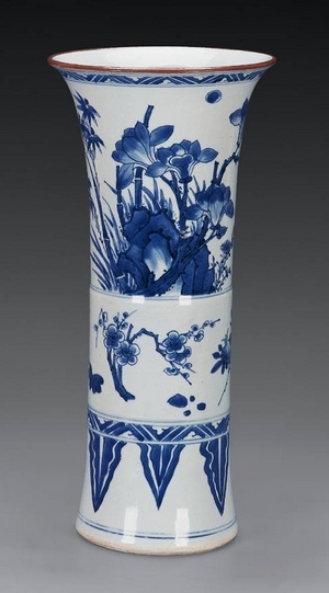 順治青花器主要有以下幾方面的特點:器型較少,主要有爐、觚、瓶、大小盤、碗、罐等。胎體總的來說較粗糙,大器如爐、大盤、觚等胎體厚重,小器如小盤、碗等胎體則較輕薄。但也有個別器物胎質(zhì)細膩、致密的,可見糯米狀。底釉多白中閃青,有的還略顯泛灰,釉層稀薄。青花料應是浙料和石子青兩種并用,致使發(fā)色有的青翠、有的青藍。其中爐的青花發(fā)色多顯青翠,其它器物的發(fā)色多顯灰藍。紋飾多見花鳥、山水、洞石、秋草、江上小舟、怪獸、瑞獸、芭蕉、云氣等。大盤喜歡在口沿處畫一青花線圈,再在圈內(nèi)畫主體紋飾;小盤多在盤面一側(cè)畫一片梧桐葉,另一側(cè)書“梧桐一葉落,天下盡皆秋”等相近的詩句。瓶、觚、罐等大器也喜歡用青花線作紋飾的分隔。畫法以勾勒、平涂、渲染、線描相結(jié)合。繪畫筆調(diào)隨意,雖然比晚明時工整,但仍未見康熙時的嚴謹、細致的作風。畫面布局較豐滿,尤其是大盤、罐、瓶、觚等類器物。開始出現(xiàn)皴法和濃淡色階的變化,但尚不成熟。瓶、觚等多平砂底。盤、碗、罐等底部多見縮釉點,底足粘砂較常見。碗的底部多跳刀痕。民窯器多、官窯器少,而且有年款的器物甚少。