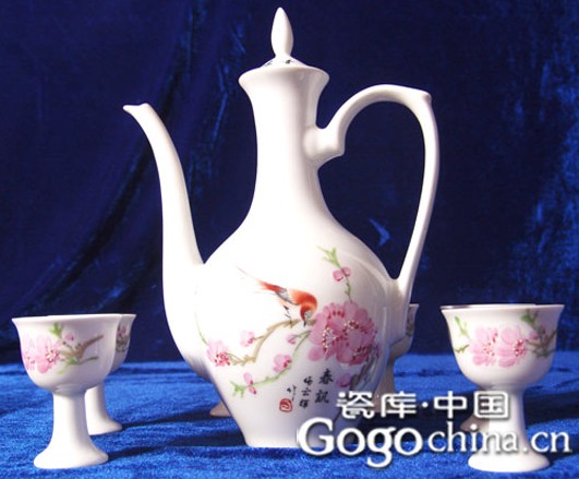 這套酒具由一只酒壺和六只酒杯組成,壺身和杯身都手繪著桃花,壺身背面題有“風(fēng)來花自笑,枝上鳥鳴和”得詩句,起到好處的把這酒杯的意境淋漓的描繪了出來,體現(xiàn)出該套酒具的高貴,是贈送朋友、客戶、領(lǐng)導(dǎo)的最佳禮品。