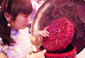 大到端莊大氣的八卦鼓桌、仿明代的卷頭幾,小到秀美的果盒、雕盤,件件展品都散發(fā)著古雅之氣。據(jù)展位負(fù)責(zé)人范女士介紹,中國云雕始于唐代,由于其雕刻的圖案均為“祥云”圖形,故被稱之為云雕。“古時,云雕可是只有皇帝才能享受到的珍品,它是我國現(xiàn)存的古老的手工藝術(shù)雕刻。”