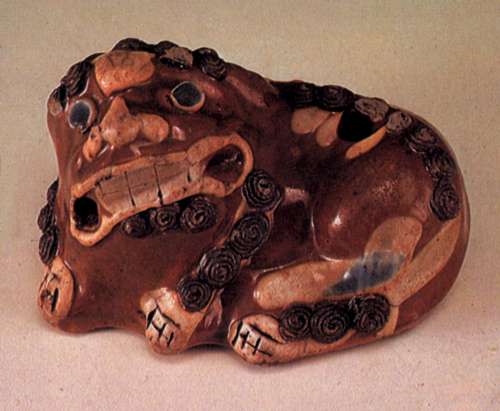 收藏陶瓷的專(zhuān)家,每談及明代瓷塑,多數(shù)側(cè)重德化窯白瓷方面,因?yàn)橛泻纬诤土殖暗劝状伤芟翊髱煛F鋵?shí),晚明嘉靖與萬(wàn)歷時(shí)期,另有不少品種不同和釉彩種類(lèi)各異的獨(dú)特精美瓷塑,為有識(shí)之士覬覦,因?yàn)橛陨竽,形象生?dòng)可愛(ài),兼富民間色彩。例如附圖為紫金釉加黃彩(眼、耳、口、鼻、爪和尾部)小獅形瓷水注,就是晚明時(shí)燒造的代表作之一(現(xiàn)藏于博物院),造型原始稚拙,十分趣怪。