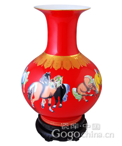 圖:八駿圖中國紅瓷藝術(shù)花瓶