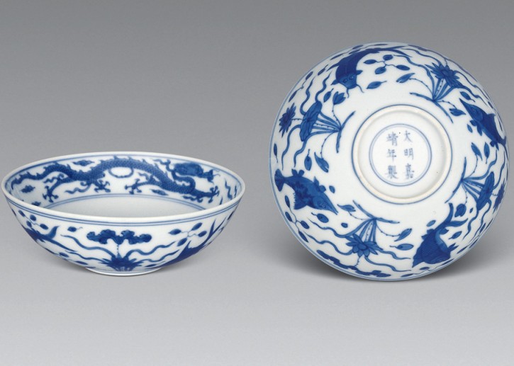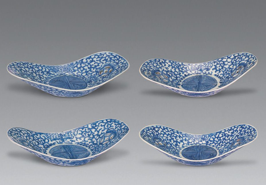 骰子碗:俗稱“骰盔子”,因與舊時賭博用具相似而得名。明宣德時期景德鎮(zhèn)燒制。器型為平沿敞口、淺弧腹、圈足,胎體厚重,器內(nèi)素白,器外多為青花或灑藍釉裝飾。