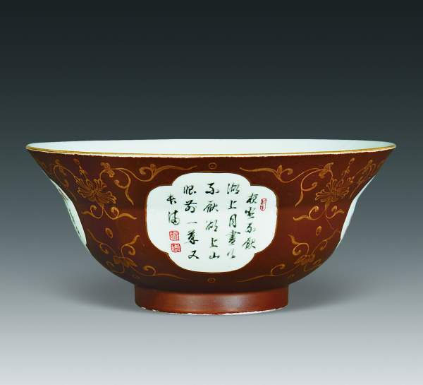 扎古扎雅木碗:是仿西藏喇嘛教木質(zhì)碗燒造的一種碗式。器呈侈口,弧腹,器壁較淺,拱壁足底,內(nèi)外施木釉或內(nèi)施金彩外施木紋釉。為清代乾隆時期的獨特造型。乾隆皇帝在其御題詩中稱其為“扎古扎雅木”。