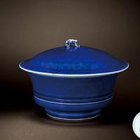 盉碗:也稱“合碗”,明宣德時景德鎮(zhèn)窯已有燒制。器型為撇口、直壁、折腹,下腹部有兩道凸起的弦紋為飾,上覆圓頂蓋,清代盉碗蓋鈕多作蹲獸式。