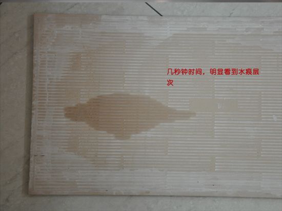 接下來,小編要來測試一下它的防水性能。把瓷片翻到背面,從左至右把水潑下去,幾秒鐘時(shí)間我們立刻看到了先接觸水的部位的水痕開始便淺,越來越淺。由于瓷片各個(gè)部位接觸水的時(shí)間都不同,所以,我們看到了依次變淺的水痕層次?梢钥闯鏊奈适呛芎玫。