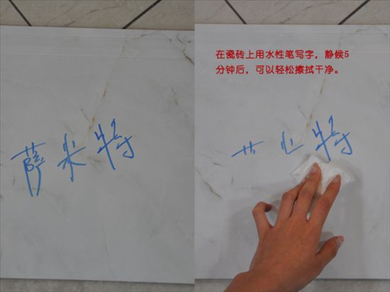 瓷片的防污能力往往是消費(fèi)者在購買瓷片時(shí)非常重視的一環(huán),一款防污能力強(qiáng),且清洗方便的瓷片總能得到消費(fèi)者的青睞。小編現(xiàn)在就來測試測試這款瓷片的奈污性,小編用水性筆在瓷磚上寫字,然后靜候5分鐘,發(fā)現(xiàn)依然可以非常輕松擦拭掉污跡,這是一款奈污能力非常強(qiáng)的瓷片!