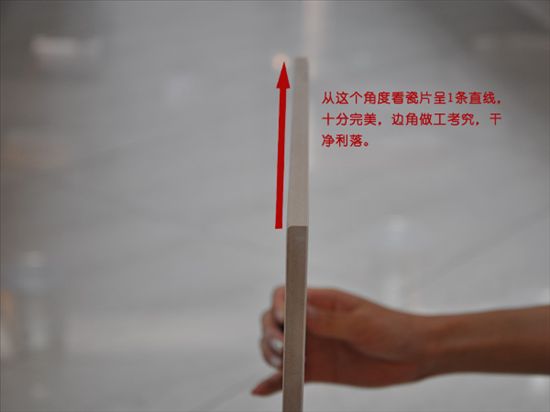 小編開始測瓷磚的邊角直度,從這個(gè)角度看過去,瓷片側(cè)面呈一條直線,非常完美。并且小編仔細(xì)觀察了瓷片的的邊角處,發(fā)現(xiàn)瓷片側(cè)平面都十分平整,看上去做工考究,且沒有任何凹凸不平處和碎料毛渣,顯得十分干凈利落!
