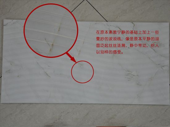在瓷片中,最容易改變的是顏色,漂亮的造型和紋理才是一款瓷片的靈魂所在。本款瓷片顏色素雅明快,給人以一種東方的放松,寧靜的感覺。而在這個(gè)基礎(chǔ)上,加上一些曼妙的波浪線,仿佛在東方的內(nèi)斂中又糅合進(jìn)一絲西方的浪漫;又仿佛寧靜的湖面上微風(fēng)拂來,湖面泛起絲絲漣漪;讓人不禁神往。