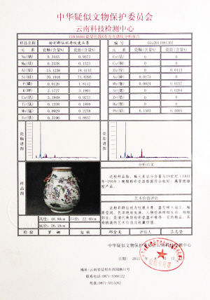 雙鹿首耳更是繪制絕妙,除了形狀寫實之外,連鹿毫及鹿角的紋路都表現(xiàn)得淋漓盡致。鹿頭突起及邊緣部分因年代久遠,粉彩釉色部分脫落,呂志堅說這是長年累月清掃灰塵留下的痕跡,并將其判為清晚期民窯產(chǎn)品。隨后進行EDX3600L儀器檢測,得出結(jié)果:“送檢樣品釉、胎化學元素成分含量與19世紀晚期(清同治、光緒前后)粉彩瓷器數(shù)據(jù)符合較好,屬景德鎮(zhèn)窯產(chǎn)品”。