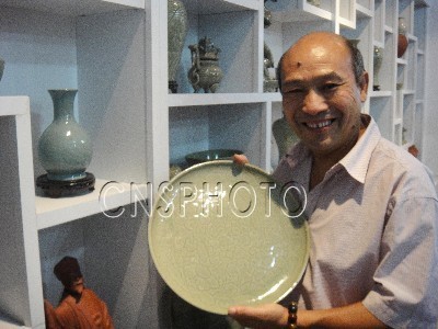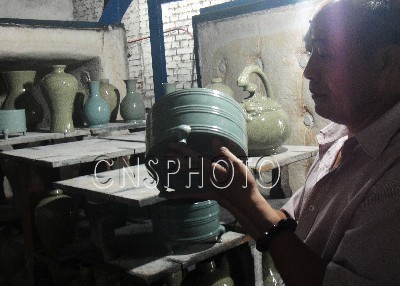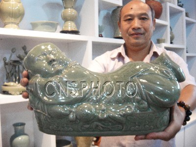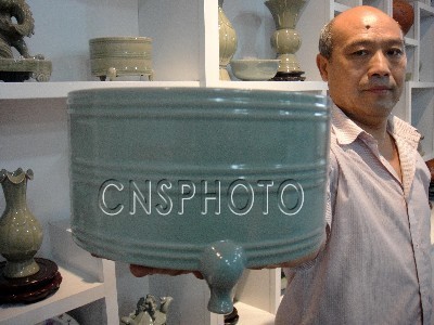 8月19日,著名陶瓷專家馬聚魁展示他新燒制的汝官瓷珍品富貴盤(牡丹圖騰)、汝瓷百子盤(石榴圖騰)、弦紋樽、孩兒枕等。河南寶豐縣汝瓷研究所所長馬聚魁癡迷汝瓷研究燒制,從1976年至今,他共完成攻關(guān)課題20余項(xiàng)。其中,《寶豐紫砂陶》填補(bǔ)了河南紫砂生產(chǎn)的空白,《汝官瓷天青釉、月白釉的仿制研究》更是達(dá)到了國內(nèi)同類研究的領(lǐng)先水平。