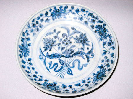 [提要] 藏品來歷:藏家劉萬忠是西安城南人,早年大學(xué)畢業(yè)后分配到一政府機(jī)關(guān)工作,事業(yè)上可謂一帆風(fēng)順。”說起眼前這件元代青花一束蓮紋盤的收藏來歷,老先生眼睛濕潤了。二人一陣擁抱寒暄后,老胡從包里取出一個青花瓷盤,說是送給老劉的生日禮物。
