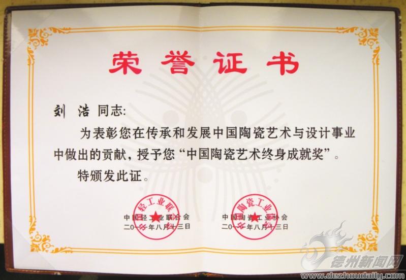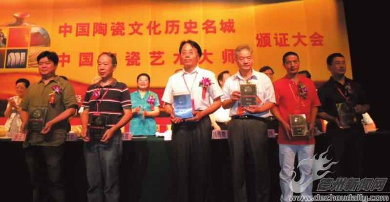 8月13日,由中國(guó)輕工業(yè)聯(lián)合會(huì)、中國(guó)陶瓷工業(yè)協(xié)會(huì)聯(lián)合舉辦的“中國(guó)陶瓷文化歷史名城和中國(guó)陶瓷藝術(shù)大師頒證大會(huì)”在北京釣魚(yú)臺(tái)國(guó)賓館舉行。會(huì)上頒發(fā)了“中國(guó)陶瓷文化歷史名城”、第二屆“陶瓷藝術(shù)大師”以及“中國(guó)陶瓷藝術(shù)終身成就獎(jiǎng)、特別貢獻(xiàn)獎(jiǎng)”獎(jiǎng)項(xiàng)。國(guó)家領(lǐng)導(dǎo)人周鐵農(nóng)、顧秀蓮等為獲獎(jiǎng)?wù)哳C獎(jiǎng)。我市著名陶藝大師劉浩先生獲得“中國(guó)陶瓷藝術(shù)終身成就獎(jiǎng)”榮譽(yù)稱(chēng)號(hào)。