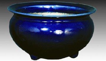 圖1、康熙景德鎮(zhèn)祭藍釉乳足爐:器型為唇口外侈,束頸,鼓圓腹,下承半圓狀三乳足,口徑25.3厘米,高14.6厘米,足距9.3厘米,爐內(nèi)施白釉,爐外施高溫鈷藍釉,釉面晶瑩剔透,像藍寶石一般,濃艷可人。仔細觀察,在釉面下聚集小氣泡遍布通體;底足露胎處,胎釉結(jié)合緊密,胎質(zhì)純凈細膩,如同糯米粉一般細白,但又不失堅致細密,胎體顯得較為厚重,整體造型古拙,凝重而質(zhì)樸,此爐經(jīng)過三百年時間,釉色乃保持著明亮清澈而不失深沉含蓄,器型完整無缺,實為一件不可多得的康熙民間佳器。