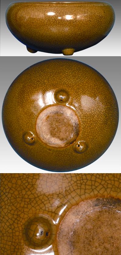 圖2、雍正景德鎮(zhèn)窯茶葉末哥釉乳足爐:器型為斂口圓弧腹?jié)u收,底承半圓狀三乳足,口徑24厘米,腹徑27.6厘米,高12.8厘米,足距10.2厘米,內(nèi)外施鱔魚黃茶葉末釉,釉色黃中泛綠似鱔魚皮,釉面勻凈肥厚、失透,起桔皮似的皺紋,并顯現(xiàn)出油膩酥光似的古舊膩光,通體片紋交織,粗紋呈墨色,紋路長縱橫全爐。細紋開片較短,顯淺紅色,形如冰裂狀,十分光潤,精美異常。外底無釉,隱約有旋紋,足端三乳足渾圓飽滿,器口施一圈醬黃釉,以示“紫口鐵足”。此爐造型淳樸、制作規(guī)整、釉色古雅,實屬雍正廠官釉之上品。