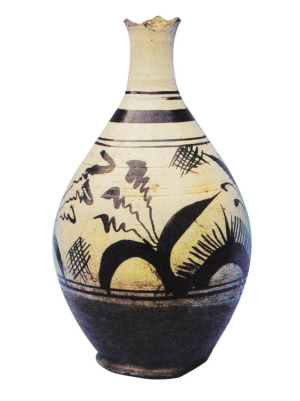 此壺上的紋飾,是用含有氧化鐵的礦物斑花石色料汁,在胎體表面所繪而成,然后入窯焙燒,成為“白地黑花”或“白地黑彩”。此件壺頸部有兩條弦紋和一條寬帶紋,腹部飾水草,裝飾技巧非常熟練,線條柔和細(xì)膩,紋飾疏密得當(dāng),淡雅大方,真正體現(xiàn)了造型美、裝飾美和色彩美。一看便知是件老器,新仿品顯然是達(dá)不到這種藝術(shù)境界的。