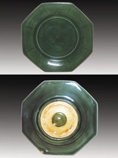 上述兩件元代龍泉青釉盤,器型碩大,口徑都在34厘米以上,它們別具一格的造型,從一個(gè)側(cè)面反映了元代龍泉窯大盤獨(dú)特的時(shí)代風(fēng)貌,在釉色和裝飾上也讓人們看到了元代在宋代的基礎(chǔ)上所具有的時(shí)代特征。在一些古陶瓷專著中,在評(píng)價(jià)龍泉窯青瓷時(shí),認(rèn)為南宋的梅子青釉在元代已無法燒制,似乎因?yàn)檎䴔?quán)的更迭使南宋龍泉窯梅子青失傳了,這種觀點(diǎn)看來是不客觀的,在這三件元代龍泉窯青釉盤中,那件八角盤便是一件典型的梅子青釉,它與南宋梅子青相比毫不遜色,也許更為成熟,它說明元代龍泉窯在南宋的基礎(chǔ)上不僅擴(kuò)大了生產(chǎn)規(guī)模,在釉色上還繼承和發(fā)展了南宋龍泉窯以釉色著稱于世的優(yōu)良傳統(tǒng)。