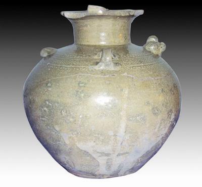 今年“五一”節(jié),筆者早早就趕到了南京朝天宮古玩市場(chǎng),發(fā)現(xiàn)有一個(gè)攤主賣的基本都是高古瓷器,有晉瓷、宋瓷,有整有破。只見(jiàn)一個(gè)買主正在和賣家為一只東晉四系罐討價(jià)還價(jià)。我眼睛一閃,攤上一只好像西晉盤口雞首壺的殘件立刻躍入眼簾,造型古樸。見(jiàn)買家和賣家依然激烈地討價(jià)還價(jià),旁邊人都在看著這兩個(gè)人,我這時(shí)蹲下來(lái),從人縫中把那只破雞壺從里面給鉤了出來(lái)。上手細(xì)看,一只典型的西晉盤口雞首壺(見(jiàn)圖),用手一量約高28cm,此壺殘缺盤口,圓腹如球形,腹身帶有一條連結(jié)雞首、雞尾及雙系的裝飾帶,寬約2厘米,遍布?jí)河〉男狈礁窦y和兩圈太陽(yáng)花。胎骨灰白,釉色偏黃,吃土較重,施釉到底,罐底有明顯的支燒火石紅痕跡。罐身正面塑貼一個(gè)母雞頭,正作張口鳴叫之態(tài),在與雞頭相對(duì)的另一端塑出雞尾,罐自然成為雞身狀。此刻我心中大樂(lè),詢問(wèn)價(jià)錢,賣家也顧不得與我討價(jià)還價(jià),我最終以不高的價(jià)錢將之拿下,收入囊中,繼續(xù)逛其他地?cái)側(cè)チ恕?/p>