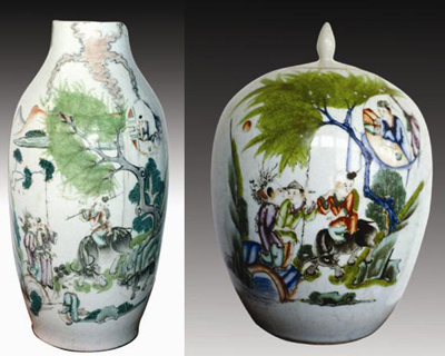 圖2、圖3:二者均為民國(guó)景德鎮(zhèn)生產(chǎn)的粉彩瓷器。圖2為花瓶(殘),剩高50厘米,底徑16厘米。圖3為深腹罐,高30厘米,底徑13厘米。圖2色彩寧?kù)o淡雅,圖3色彩明快艷麗。兩者畫面大體相同:漁翁(圖2)、漁郎(圖3)垂釣歸來(lái)在樹(shù)陰下的小石橋上碰到砍柴負(fù)薪歸來(lái)的樵夫,于是兩人相視而語(yǔ),牧牛童子肩扛竹鞭,騎在牛背上悠哉行來(lái),引得高樓寒窗苦讀的童子(圖2)、書生(圖3)好生羨慕,起身俯視嘖嘖贊嘆……