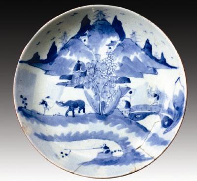 圖1:光緒青花“漁樵耕讀”瓷盤,該瓷盤產(chǎn)于景德鎮(zhèn),直徑24厘米,胎瓷潔白、青花發(fā)色純正淡雅,一幅中國(guó)傳統(tǒng)的寫意山水“漁樵耕讀”圖躍然眼前。漁夫在河邊靜坐垂釣,樵夫擔(dān)著兩捆柴禾吃力地在石拱橋上蹣跚行走,犁田歸來(lái)的耕夫牽著翹首擺尾的水牛緩緩而行,樹(shù)下屋中的書生,低頭弓腰苦讀之乎者也……
