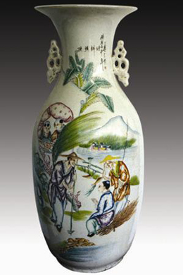 圖4:為民國(guó)壬午年1942年北方窯口生產(chǎn)的粉彩“漁樵耕讀”大花瓶,此瓶高56厘米,底徑16厘米。胎體較前三樣粗糙,底釉釉色慘白,但粉彩畫面鮮艷光亮。圖中背襯蕉林遠(yuǎn)山、蘆蕩鴛鴦、流水圍欄,白發(fā)漁翁右手執(zhí)穿魚(yú)柳條,左手拄著釣竿,樵夫坐在柴禾上歇息,犁田歸來(lái)的農(nóng)夫以鋤為杖,拄著地與樵夫漁翁閑談,兩名讀書童子懷抱書本,趴在窗口,似懂非懂地聆聽(tīng)三人的話語(yǔ)……