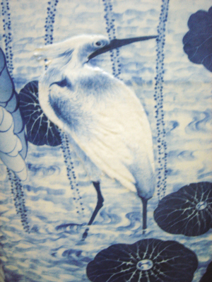瓶頸和腹體裝飾都是分三個(gè)主要層次:上層是復(fù)式如意云首,每一云首內(nèi)繪一朵蓮花,為明洪武、清康熙云首風(fēng)格,瓶頸、腹體如一;中層為主畫面,瓶頸簡(jiǎn)約地繪畫一周連枝葡萄,瓶腹體繪荷塘景物通景一周,為整個(gè)瓶體裝飾的主畫面;下層為復(fù)式變形蕉葉紋飾,每一蕉葉尖飾一云頭,云頭內(nèi)繪一朵蓮花。腹體主畫面所繪蓮荷的蓬、花、苞、葉含放舒卷自如,蓮荷之間繪有四只款款飛舞的蜻蜓,三只立于荷梗之上的精靈黃鶯,三只偃仰反側(cè)的鷺鷥,三只姿態(tài)各異(蹲、跳、浮游)的青蛙。整個(gè)荷塘極具縱深感、立體感,景物工寫兼?zhèn)洌瑸t灑飄逸,栩栩如生,一派生機(jī)勃勃的景象。瓶頸的上、下口沿另外繪有云氣紋和回紋一周,使瓶頸愈發(fā)顯得富麗堂皇;腹體脛下另有一組波紋曲線和一圈連枝紋環(huán)繞。整個(gè)瓶體畫面莊嚴(yán)大方,氣象清新。
