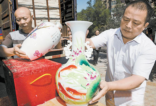23日,工作人員正在檢驗(yàn)托運(yùn)來的景德鎮(zhèn)瓷器。