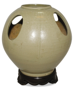 眼前這只線條流暢,釉色可人的青瓷器(見圖,高13.6厘米,圓孔4.5×3.2厘米)是我國晉代時期著名的越窯生產(chǎn)的鴨蛋形圓孔香薰器。筆者見過不少各朝各代的香薰器型, 但是像這樣的沒見過。