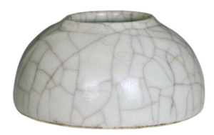 哥窯開(kāi)片馬蹄形水盂(圖1),高4.5厘米,口徑2.9厘米,長(zhǎng)直口、溜肩,圓腹,平底露胎,周身碎開(kāi)片,釉色瑩潤(rùn),造型優(yōu)雅。