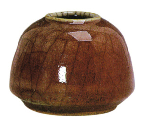 豇豆紅水盂(圖2),高5.5厘米,口徑2.7厘米,短直口,溜肩,圓腹,圈足,周身碎開(kāi)片,釉色瑩亮,造型別致,給人以簡(jiǎn)潔大方、嬌巧玲瓏的感覺(jué)。