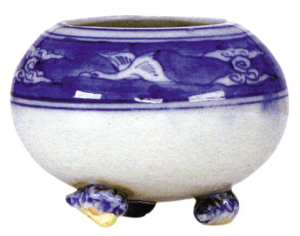 青花云雁紋水盂(圖3),高5.3厘米,口徑4.8厘米,平口,溜肩,圓腹,青花螺螄三足托起盂體,口沿、腹中分別飾有兩道和一道青花線,腹繪青花云雁紋,下部留白;整體構(gòu)思奇巧,造型雅致,獨(dú)特古樸,釉色光亮,青花發(fā)色沉靜素雅,可謂天水一色,堪稱(chēng)水盂精品。