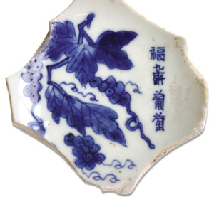 葡萄。明清之際,以葡萄為題材入青黃花瓷畫者甚多。作為瑞果,主要取其累累果實,“多子多福”之意。