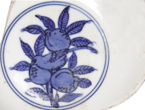 石榴。石榴花是繁榮昌盛、和睦團結(jié)的喜慶佳兆;果為多子多孫、多福多壽的祥瑞象征,在明中、晚期青花瓷上為多見。畫面上一株石榴,漿果破皮而出,寓意“榴開百子”。榴、桃、佛手同繪,為多子、多壽、多福。