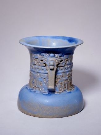 花囊撇口,粗長頸,短腹,圈足。頸部凸雕饕餮紋,頸兩側(cè)置對稱獸頭長鼻耳。紫砂胎,外罩乳濁的天青釉,釉汁肥厚。