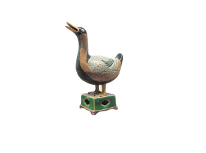 李一平介紹,該器模制,分上下兩截。鴨頸中空與口相通,腹部合縫處子口上勻布六個(gè)隱孔,空氣可從隱孔進(jìn)入腹內(nèi),并與張的鴨嘴對(duì)流。它比將對(duì)流孔設(shè)在鴨背的東周曾侯乙墓鴨形香盒、宋銅器鴨熏、宋影青釉瓷鴨熏更為巧妙美觀。